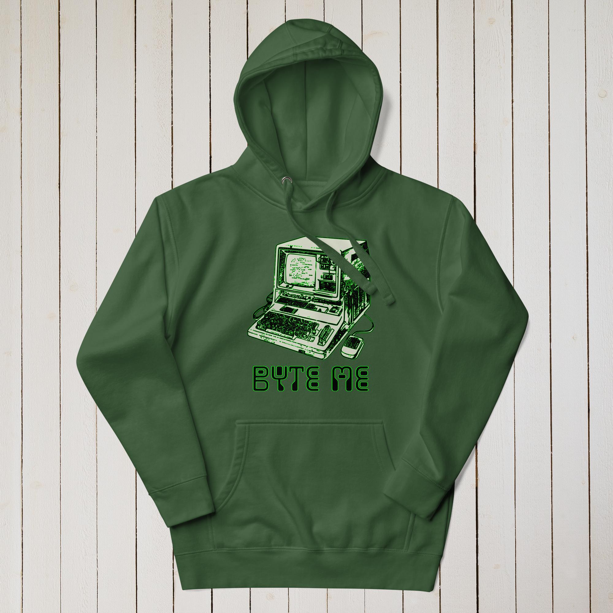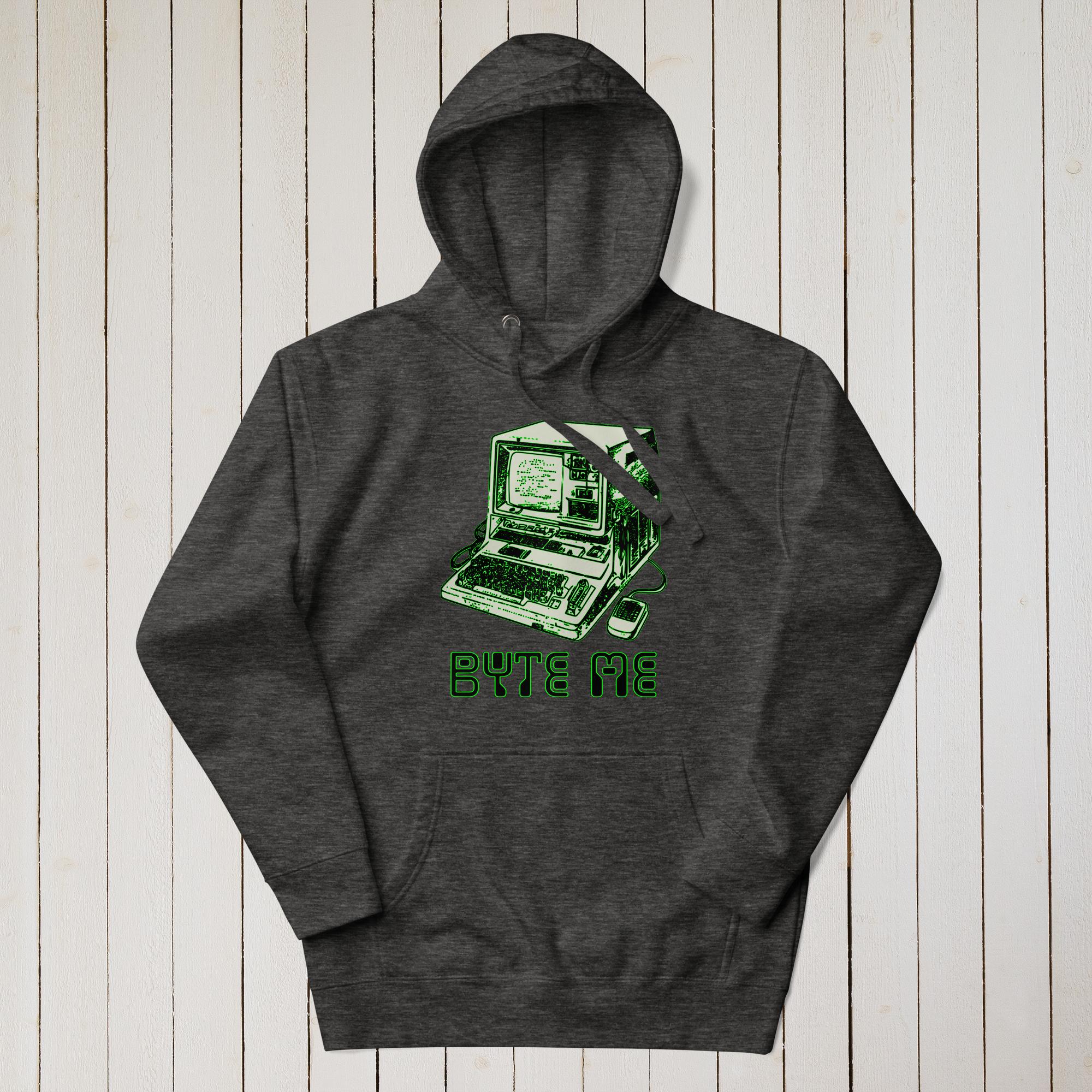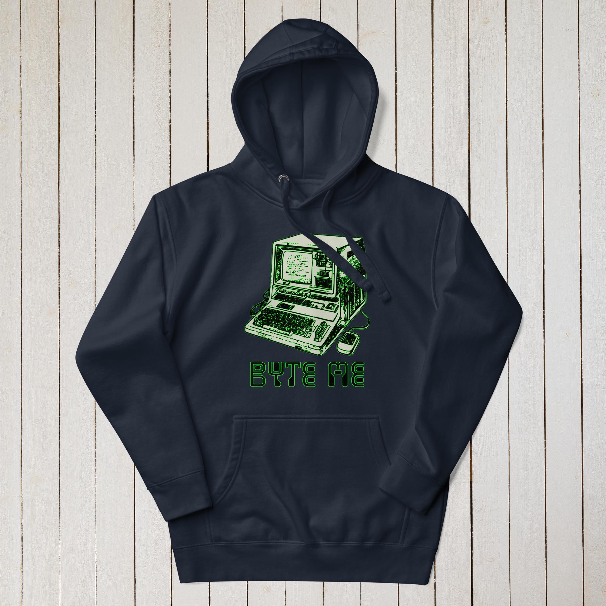 Try out our take on the classic cotton hoodie with a retro computer graphic with the phrase Byte Me.